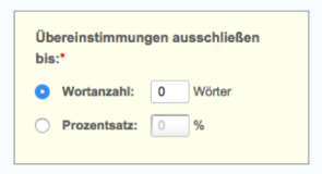 Alternativ dazu können Sie Übereinstimmungen auch nach Prozentsatz ausschließen. Geben Sie hierzu den Prozentsatz der Wörter ein, die bei der Prüfung zur Generierung von Ähnlichkeitsberichten ausgeschlossen werden sollen.