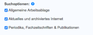 Mit der Einstellung für Suchoptionen können Sie festlegen, mit welchen Turnitin-Ablagen von Studenten übermittelte Arbeiten bei der Generierung von Ähnlichkeitsberichten für Arbeiten verglichen werden. Auf diese Weise kann eine Lehrkraft einen Quelltyp ausschließen, wenn ein Vergleich mit dieser Quelle nicht erforderlich ist. Wenn eine Ablageoption deaktiviert wird, kann der Prozentsatz für den Ähnlichkeitsindex u. U. sinken.