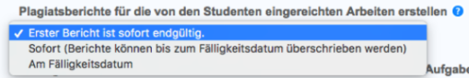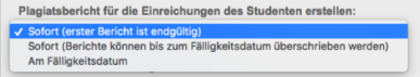 Wählen Sie aus der Dropdown-Liste aus, wann Ähnlichkeitsberichte nach der Übermittlung von Arbeiten durch Studenten erstellt werden sollen. Für diese Aufgabeneinstellung stehen drei Optionen zur Verfügung: