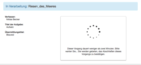 Klicken Sie auf Übermitteln, um das Hochladen der ZIP-Datei für die Aufgabe abzuschließen. Klicken Sie andernfalls auf Zurückgehen, um ggf. Änderungen vorzunehmen. Eine Fortschrittsleiste zeigt die verbleibende Zeit für den Hochladevorgang an.