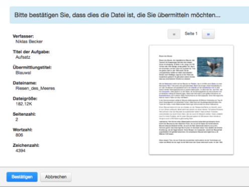 - Nach dem Hochladen wird die erste Seite der übermittelten Arbeit angezeigt. Überprüfen Sie den Text, um sicherzustellen, dass die richtige Datei ausgewählt wurde. Mit den Pfeilen über der Dokumentvorschau können Sie weitere Seiten des Dokuments überprüfen.