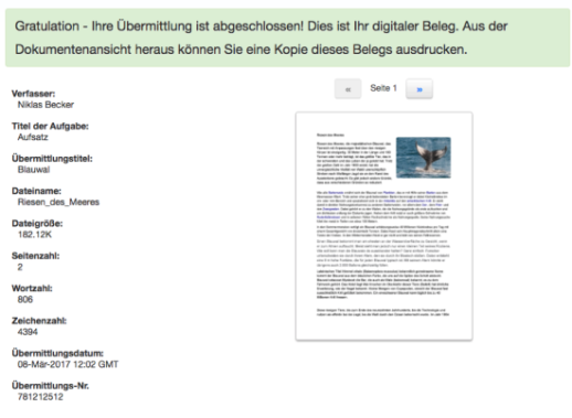 - Nach Abschluss der Übermittlung wird ein digitaler Beleg angezeigt. Die Übermittlungs-Nr. des digitalen Belegs ist eine eindeutige, dieser übermittelten Arbeit zugewiesene Nummer. Eine Kopie des digitalen Belegs kann über die Druckoption der Dokumentenansicht heruntergeladen werden.