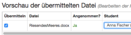 - Nach dem erfolgreichen Hochladen Ihrer ersten Datei wird diese in der Liste „Vorschau der übermittelten Datei“ angezeigt. Wählen Sie im Dropdown-Menü auf der Übermittlungsseite den Namen eines eingeschriebenen Studenten aus. Arbeiten, die von einer Lehrkraft im Namen eines Studenten hochgeladen wurden, werden im Studentenportfolio angezeigt.