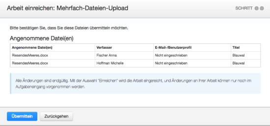 - Ein Bestätigungsbildschirm wird angezeigt, in dem alle Datei- und Verfassernamen, E-Mail-Benutzerprofile und Titel der übermittelten Arbeiten aufgelistet sind. Die Felder mit den Einträgen „Anonym“ oder „Nicht eingegeben“ sind nicht erforderlich. Sie können jedoch festgelegt werden, wenn Sie auf die Schaltfläche Zurückgehen klicken, um zum vorherigen Bildschirm zurückzukehren.