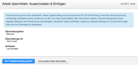 - Klicken Sie auf Zum Aufgabeneingang gehen, um die Liste der aktuellen, von Studenten übermittelten Arbeiten anzuzeigen, oder klicken Sie auf Eine andere Datei übermitteln, um weitere Dateien als Student zu übermitteln.