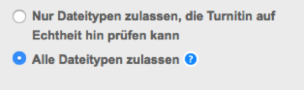 - Legen Sie fest, ob für die Übermittlung der Arbeit Ähnlichkeitsberichte erforderlich sind, oder ob beliebige Dateitypen hochgeladen werden können. Die Standardoption lautet Nur Dateitypen zulassen, die Turnitin auf Echtheit prüfen kann. Bei Aufgaben, für die keine Ähnlichkeitsberichte erforderlich sind, können Sie die Option Alle Dateitypen zulassen auswählen. So können Lehrkräfte Feedback für alle Dateitypen geben.