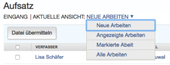Hiermit kann eine Lehrkraft auswählen, welcher Ordner eines Aufgabeneingangs angezeigt werden soll. Standardmäßig sind alle Arbeiten im Ordner „Neue Arbeiten“ gespeichert. Arbeiten können mit der Funktion Verschieben nach zwischen den Ordnern des Aufgabeneingangs verschoben werden. Arbeiten können nur in einem Ordner gespeichert werden. Bei Auswahl eines Ordners wird nur dieser angezeigt, es sei denn Alle Arbeiten ist ausgewählt. In diesem Fall werden alle Übermittlungen für eine Aufgabe angezeigt.