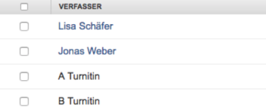 - Verfasser – Diese Spalte enthält die Namen aller eingeschriebenen Studenten sowie die Namen für alle von einer nicht eingeschriebenen Lehrkraft hochgeladenen Arbeiten für die Aufgabe. Wenn Sie auf den Namen des Verfassers klicken, wird die Seite mit dem Kursportfolio für einen eingeschriebenen Studenten geöffnet. Die Namen von eingeschriebenen Studenten werden in blauer Schrift und unterstrichen angezeigt.