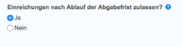 - Legen Sie fest, ob Übermittlungen nach dem Fälligkeitsdatum der Aufgabe zugelassen werden. Wenn die entsprechend Option auf Ja gesetzt ist, können die Studenten nach dem Fälligkeitsdatum Arbeiten für die Aufgabe übermitteln, vorausgesetzt sie haben zuvor noch keine übermittelt. Ist die Option auf Nein gesetzt, können die Studenten nach dem Fälligkeitsdatum der Aufgabe keine Arbeiten mehr übermitteln.