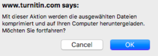 - Wenn Sie „Originaldatei“ auswählen, wird ein Dialogfeld angezeigt, das Sie darauf hinweist, dass die Datei komprimiert und auf Ihren Computer heruntergeladen wird. Klicken Sie zum Akzeptieren auf OK, oder auf Abbrechen, um den Vorgang abzubrechen. Bei großen Dateien werden Sie auf der Registerkarte für Nachrichten von Turnitin darüber informiert, wann die Datei nach der Komprimierung heruntergeladen werden kann.
