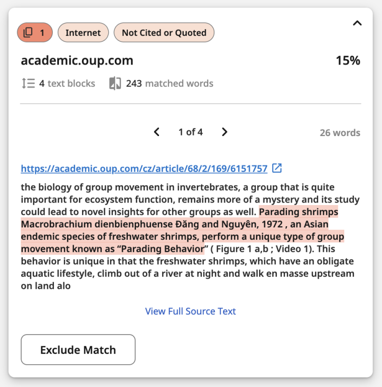 - Jeder bei diesem Vergleich identifizierte, übereinstimmende oder sehr ähnliche Text wird im Ähnlichkeitsbericht aufgeführt.