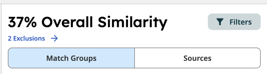 - Top-Quellen – Bei Top-Quellen handelt es sich um eine Liste von Quellen, die in absteigender Reihenfolge nach ihrer prozentualen Gesamtähnlichkeit geordnet sind. Wählen Sie eine Quelle aus, um die entsprechende Markierung in der Einreichung hervorzuheben.