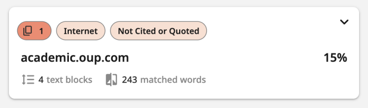 Die dritte Zeile zeigt die Anzahl der übereinstimmenden Textblöcke zu dieser Quelle und Übereinstimmungsgruppe sowie die Gesamtwortzahl für alle Übereinstimmungen mit denselben Kriterien.