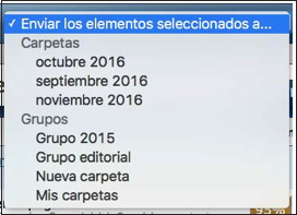 Nota: Los documentos sólo pueden ser desplazados a carpetas y las carpetas sólo pueden ser desplazadas a grupos de carpetas. El menú de despliegue de “Enviar los elementos seleccionados a…” se divide en dos secciones: Carpetas y Grupos. Las carpetas y los documentos no pueden moverse simultáneamente, sino por separado.