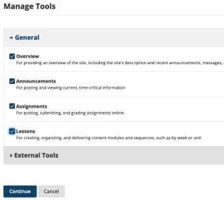 Using the list of available tools, find the Lessons option in the General section. Select the relevant checkbox, and then use the Continue button at the bottom of the list.