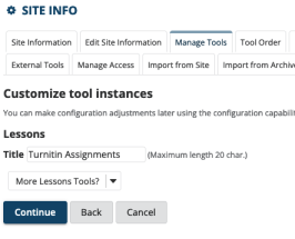 Sakai's Lessons can allow for Turnitin to be used multiple times within the same site. The lesson will contain all of your Turnitin assignments grouped together in one place. Firstly, we must enable the Lessons functionality for the worksite.
