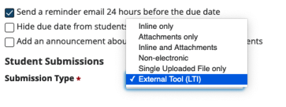 Once you're at the Submission Type option, change it to External Tool (LTI).
