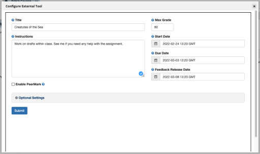 A modal will appear with the LTI 1.3 configuration screen. If you've used Turnitin LTI before, this will be very familiar. If this is your first time using Turnitin, we have extensive guidance on what all of the different settings mean in dedicated guides. If you're just interested in the core settings, you can edit them now. Select Optional Settings to tailor the assignment to specifically meet any learning goals you may have.