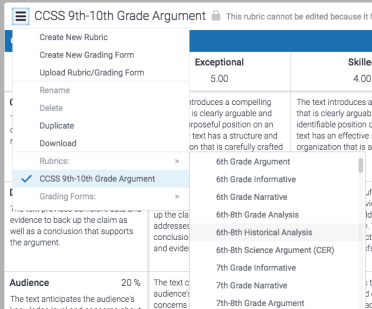 The options menu allows you to create new rubrics, view different ones, and even export them to share with other instructors. The options menu also displays all rubrics that are available for your account. As a default, the currently attached rubric will also appear at the top-level of the menu. All other rubrics will appear under the Rubrics: side-menu, accessible by moving focus to the Rubrics: title, and it will display a list of all available rubrics.