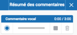 - Les commentaires vocaux ont une durée maximale de trois minutes. Cliquez sur le bouton d’enregistrement (bouton le plus à gauche) pour lancer l’enregistrement. Cet outil vous permet de suspendre, d’arrêter, d’enregistrer ou de supprimer votre enregistrement.