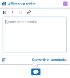 - Cliquez sur le bouton Affecter un critère en haut de la zone de texte du commentaire bulle pour afficher une liste de critères. Sélectionnez le critère à affecter au commentaire bulle.