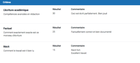 Si l’enseignant a utilisé une fiche d’évaluation pour noter votre copie, vous pouvez consulter les scores et commentaires relatifs à chaque critère d’évaluation.