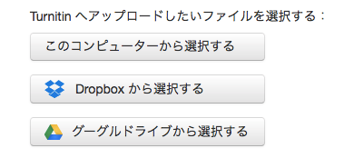 注意:Google Drive™ を使用して提出する場合、ブラウザでサードパーティの cookies を許可する必要があります。そうしないと、Google にサインインして Google Drive からアップロードしようとしたときに失敗します。Google Drive の機能は IE8 またはそれ以前のバージョンではサポートされていません。Google Doc(.gdoc)ファイルを Turnitin に直接アップロードしないでください。gdoc ファイルにはドキュメントは含まれませんが、Google Docs によるオンラインでの参照が含まれています。