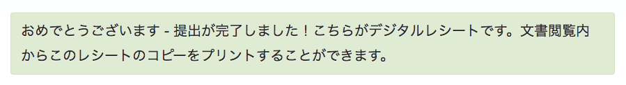 提出が完了すると、デジタルレシートが画面に表示されます。ユーザーのログインに使用されるアドレスにも電子メールでコピーが送信されます。提出が完了した証拠として、レシートとそれに記載されている提出 ID を保存します。