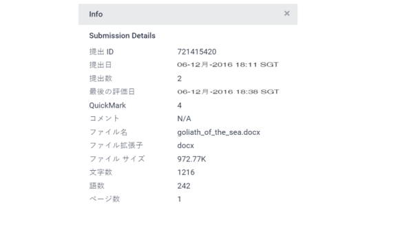 2. 提出物の情報ボックスには、提出日、最後の評価日、文字数等の、レポートに関するすべての情報が表示されます。