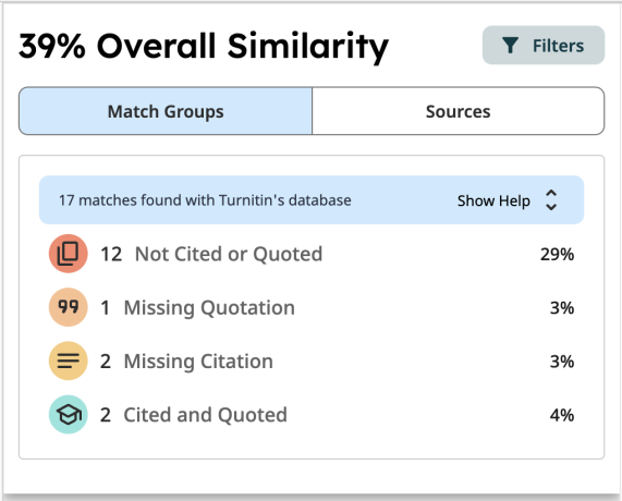 Samsvarsgrupper-visningen deler den generelle likheten inn i fire kategorier: Ikke sitert, Manglende siteringer, Manglende sitat, eller Sitert. Teksten til hvert likhetssamsvar er uthevet i korresponderende samsvarsgruppefarge, avhengig av om sitater eller anførselstegn er registrert nær den teksten.
