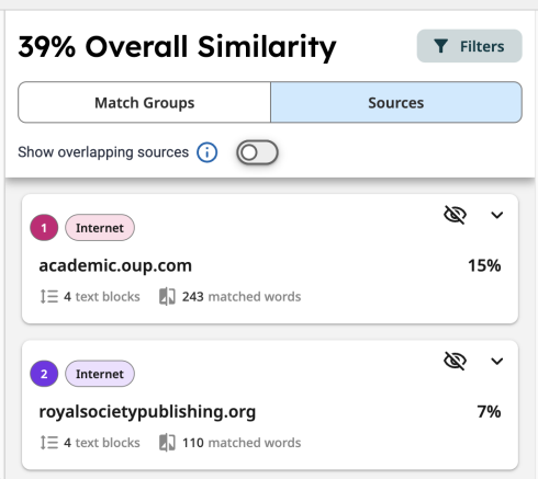 Bruk filtrene til å tilpasse rapporten for å vise eller skjule visse samsvar og kilder, avhengig av deres relevans for din gjennomgang. For eksempel, når Bibliografi-filteret settes i «av»-posisjonen, skjules alle samsvar funnet i bibliografien eller kildehenvisninger på slutten av en innsending.