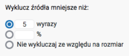 2. W panelu bocznym Filtry i ustawienia użyj przycisków opcji i pół tekstowych do wprowadzenia wykluczeń dotyczących raportu. Można wykluczyć źródła, które zawierają mniej wyrazów niż określona ilość wyrażona liczbą lub procentowo.