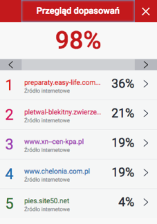 1. Przegląd dopasowań umożliwia analizę wszystkich dopasowań, które zostały znalezione w danej pracy, i pozwala zobaczyć wynik podobieństwa. Aby wyświetlić przegląd dopasowań, kliknij czerwony numeryczny wynik podobieństwa na pasku narzędzi produktu.