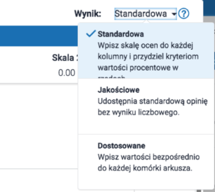 Arkusz standardowy: pozwala wprowadzić wartości skali i wartości procentowe kryteriów. Maksymalna wartość dla arkusza standardowego będzie taka sama jak najwyższa wprowadzona wartość skali.