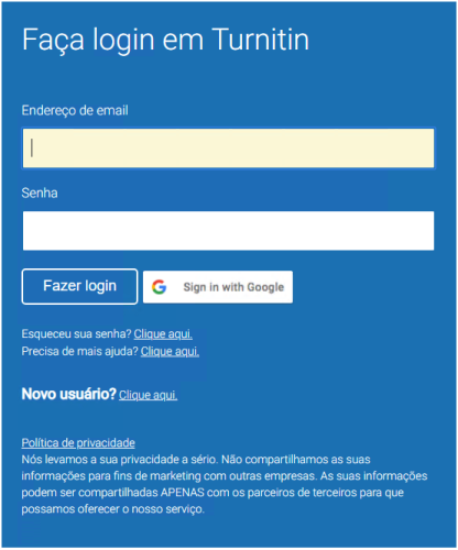 Para começar a usar o Turnitin, você deve primeiro fazer o login. Durante o login, um cookie será configurado no seu navegador para permitir que o Turnitin autorize o acesso durante o uso do site. Certifique-se de que o navegador usado permita a configuração de cookies. Consulte as informações de ajuda ou suporte do navegador para obter mais informações sobre como permitir os cookies do nosso site, www.turnitin.com.