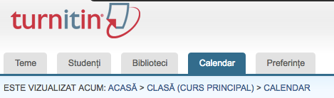 Dacă dorește să acceseze calendarul cursului, profesorul trebuie să se conecteze la Turnitin și să dea clic pe titlul cursului pentru a intra în acesta. După ce cursul este deschis, dați clic pe Turnitin și pe titlul cursului pentru a intra în acesta. După ce cursul este deschis, dați clic pe fila calendar pentru a deschide calendarul cursului.