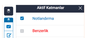 Katmanlar birden fazla hizmeti aynı anda görüntülemenize olanak tanır. Katmanlar ürün araç çubuğu veya Etkin Katmanlar yan paneli kullanılarak açılabilir ve kapatılabilir.